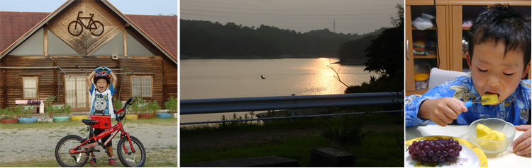 今日はこんな事をして遊んだ~(QT動画、約25秒)午前中は雨だったけど、午後からは雨が止んだので、鉄道おもちゃ屋へ出掛けた。鉄道おもちゃ屋で遊んでいたら晴れ間が出てきたので、伊坂ダムへも寄って遊んできた。今日はhitoが二人乗りの変わり自転車に乗りたいと言うので、結局、散々運転させられて疲れた~ってことで、夕食は手巻き、めかぶ、牛乳(500ccも飲んだのに、味噌汁と海鮮サラダは要らないって何故?)生ハムを買い忘れたので今日はロースハムだったけど、hitoはご機嫌でした。伊坂ダムサイクルパークのMT・変わり自転車コース。ダム湖を周回するコースは3.6kmで、向こうに見える山並みまで行くことになる 鉄道おもちゃ屋でホタ君とビデオを見た。 伊坂ダムの変わり自転車に乗りまくり~ 二人乗りを漕がされて父さんはヘトヘト~(涙)