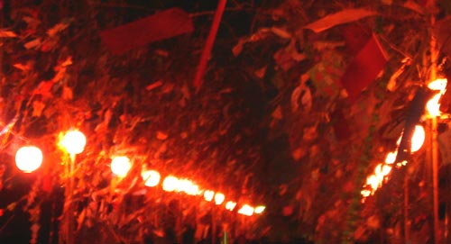 hitoが保育園から笹飾りを持ち帰えった。笹飾りと良く見ると全てが天然素材、、、竹、紙、紐も紙で作ってあったので、これなら流しても大丈夫だと、hitoと一緒に自転車で笹流しに出掛けることにした。ライトの付いていない自転車に部屋のセンサーライトを括り付けるのに悪戦苦闘『8時になったら終わっちゃうよ~』 と言うhitoに急かされながら、何とか取り付けて、7時30分に出発! (会場までは15分程度の予定)笹流しの会場になっている橋は交通公園への道のりの途中にあるので、hitoにとっては通い慣れた場所だけど、夜道は初めてなので慎重に走ってました。誰でも参加できる笹流しなので、会場の橋へ近づくと笹飾りを持った親子連れでいっぱい!hitoは笹飾りを川へ投げたくて仕方ないようだったけど、流れに合せて移動し、記念撮影をしてから橋の真ん中辺りで川へ投げ入れた。願いが叶うと良いね。。。 (トライアル自転車の選手のこともトライアル○イ○ッ○って言うな~ 笑)橋を歩いていたら、保育園の保育士さん達が待っていてくれて、お菓子を配ってくれました。園のほとんどの保育士さんが居てくれたのには驚いたけど、hitoは嬉しくてニコニコ!たくさんの友達とも会い、いろんな話をして楽しんでいたら、あっと言う間に終了時間これで終了しますの放送が流れたので、皆にバイバイ~と挨拶をして帰路に着いた。帰り道はさらに暗かったので安全運転、、、 安全運転の褒美か? 踏切で電車を見ることができました。それにしもて真剣な眼差しで電車を見るよな~ (笑)::::::::::::::::::::::::::::::::::::::::::::::::::::::::::::::::::::::::::::::::::::::::::::::::::::::::::::::::::::::::::::::::::::::::::::::::::::帰宅したら午後8時40分、、、 作る気力も無かったのでスーパーへ直行わさび抜きと普通の握り寿司とサラダを半額で買って夕食。。。 今日も手抜きでした。写真をクリックするとhitoの願い事が、、、(QTアルバム、25秒)