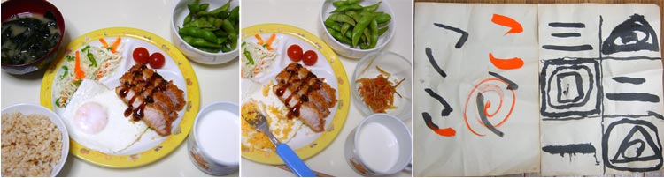昨晩、F1とF-NIPPONを見てから眠ったからか? 今朝、hitoに起されたら9時、、、遅刻だ~慌てて準備をして店によって書類を取り、保育園へhitoを送った。(毎日持参するお茶を沸かして冷すのに時間が掛かった~ 爽健美茶を買い置きしないとな~)今日明日は保育園でホリデーと言う行事があり、年少~年長は泥んこになったり、ボディーペインティングをして楽しみます。::::::::::::::::::::::::::::::::::::::::::::::::::::::::::::::::::::::::::::::::::::::::::::::::::::::::::::::::::::::::::::::::::::::::::::::::::::午後7時にhitoを迎えに行くと着替えの服までドロだらけだったから、ホリデーでの泥んこ遊びを思いっ切り楽しんだようです。今日もhitoが練習に行くというので交通公園へ寄り、自転車の練習。。。いつもの縁石3段越えを往復する5段越えを、あっさり成功! 徐々に上手くなってます。(笑)夕食は、とんかつ、目玉焼き、茹で野菜、味噌汁、枝豆、きんぴら、ご飯、牛乳でした。最初の写真にきんぴらを入れ忘れたので写真を撮り直すと、hitoは黄身を粉々にして中を調べてました。目玉焼きを初めて食べるhito、、、どこが卵なの?だって(白身が理解できないようです)