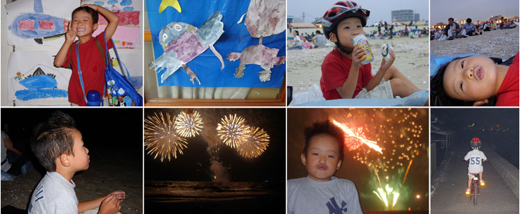 今日の午後は仕事を休んで皮膚科受診と子育て支援センターへ出掛け、皮膚科では、足のイボを診てもらって、アトピーの飲み薬を処方して頂き、子育て支援センターではボールプールで遊んだり、保育士さんと遊んだりした。一旦帰宅して、店が終わる午後6時過ぎに花火見物に自転車で出発!途中のコンビニでおにぎりとお茶を買込んで(私は家から雑酒を持参)から交通公園へ砂浜の最前列にシートを敷いて寝転びながら花火始まるのを待っていたら、風と波が強くなって、砂は飛ぶし、波は激しくなるし、、、でも、波の音を聞きながら花火を見るなんて、そんなに出来ない体験だもんね。(笑)hitoは綺麗!と声を上げながら花火を楽しんでいました(QT動画、50秒、2MB)。保育園に貼ってあった写生大会の絵(hitoのは左下) 宇宙人の絵(左下) おにぎりを食べて缶ビール(中はお茶)を飲む 家宝は寝て待て花火に見入るhito 海も白く光って綺麗だ~ 花火をバックに記念撮影 夜道を気をつけて帰るよ~