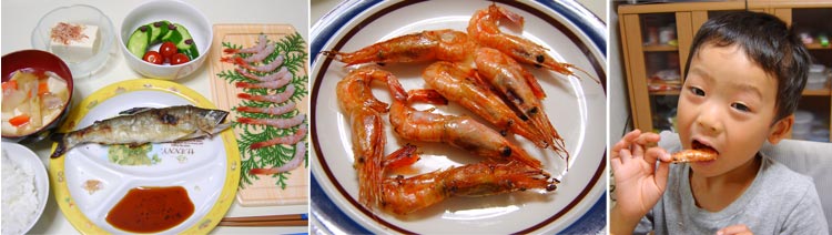 土曜日の夜の花火と昨日の遊びで疲れたのか、今朝のhitoは寝坊をして起きたのは8時30分起きてからは元気なので良いのだけど、体調を崩さないようにしないとな~週末にはキャンプもあるから、、、迎えの時に担当の保育士さんに聞いたら、hitoは元気に過ごしていたようです。今日は夕食時に寝ることも無く、魚を少し残しただけで、後は綺麗に食べました。(笑)夕食は、鮎の塩焼き、甘海老、豚汁、奴豆腐、キューリ・トマト、ご飯、牛乳、甘海老の素揚げ久しぶりにガスコンロの魚焼きグリルを使ったら、やはり旨そうに焼けたな~ (後片付けは大変だけど、、、)酒のつまみに甘海老を揚げたら、hitoが1尾だけ食べた。殻付きを食べるのは初めてかも?