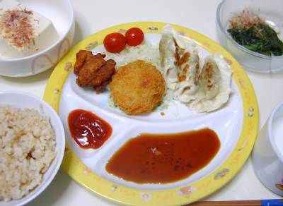 6時にhitoを迎えに行って一旦家に戻り、ベランダの向こうにある幼稚園の夕涼み会へ出掛けた。あいにくの雨だったけど、受付で切符を買って、室内でいろんなゲームをして楽しみ、ゲームの度に頂くお菓子と、切符で買ったパンやジュースを抱えてhitoはニコニコ。。。部屋から近くても、幼稚園には友達がいない為、遊び終わるとhitoは少し物足りなくなり、頂いたシャボン玉で遊びたいと言いだしたので、そのまま帰宅。私が食事の用意をしている間、hitoはベランダでシャボン玉を飛ばして遊んでました。食後にベランダへ出てみると、魚釣りの会場が盆踊り会場になっていて、皆が踊っていたので、それを見たhitoは、もう一度行きた~い!だって、、、もう遅いので行かなかったですけどね。夕食は、コロッケ・唐揚げ・餃子・茹でキャベツ、冷奴、小松菜のおひたし、ご飯、牛乳でした。写真をクリックすると夕涼み会の様子が見られます。(QTアルバム、約50秒)
