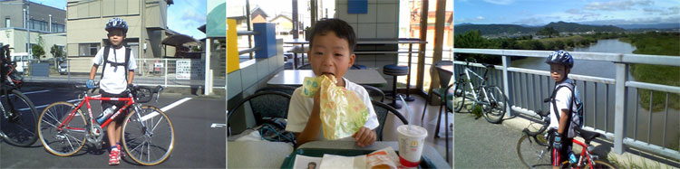 日曜日は、バイクトライアルというじてん車のれんしゅう会があった。むずかしいセクションでは、はじめはへたで5点ばかりだったけど、れんしゅうしたらすぐにできるようになって、5点から2点になったのでとてもうれしかった。 hito (宿題のあのね帳)ヤダサイクルの練習会に参加する為、自宅から自走で会場の公園へ距離は3kmチョットだけど、私はバテバテ、、、 最後の登りはhitoに先に行ってもらって、私は自転車を押して歩きました~(涙)今日の参加者は、yadaさん、玉ちゃん、Bさん(以上の3名は世界戦オープンクラスに参加)四日市のUさん親子3名、草津のUさん親子2名、hitoと私、、、 大人6名、子供4名hitoと同い年の四日市のU君は既にダニエルをマスターして約1mの段差を飛び降りてました~hitoもダニエルをしたいようですが、、、 練習しないヤツには出来ないぞ~~~!まあ、それでも今日はセクションを何度も走っていたから善しとしましょう。昼食は、皆でいつものホテルのバイキング、、、 今日のhitoは結構沢山食べてました。ヤダサイクルに寄ってから自宅に戻り、シャワーを浴びてから中勢グリーンパークへ今日は大き目のボールを使ってキャッチボールをしたけど、hitoは以前と同じような調子で良いボールが来たり、とんでもないボールが来たり、、、 相変わらずキャッチは下手でした。疲れて鉄道おもちゃ屋へ行く気力が無くなったので、そのまま帰宅することに、、、国道23号に出る信号待ちで、『お父さん、緑色のシャツの人だよ!』 と隣の車を見てhitoが叫んだので、何事かと思って見てみたら、今日練習会で一緒だったBさんで、玉ちゃんを送ってから自宅に戻る途中でした。何と言う偶然だろう? (笑)