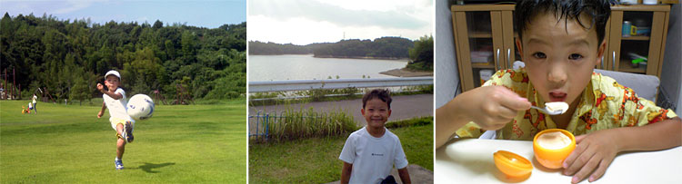 2日目天気:晴れ時々曇り宿題:計算ドリル3枚、漢字ドリル4ページ遊び:DSを30分、サッカーのパス練習、ホタ君とプラレール特記:午前中は宿題をしてDSで遊んでテレビを見て過ごし、午後は中勢グリーンパークでサッカー、 四日市へ移動して鉄道おもちゃ屋、伊坂ダムへ寄ってから、ヤダサイクルでVブレーキを買って帰宅生活:昨日の不規則な睡眠で朝6時半に起床した。 夕方に眠くなったのを我慢させたら、夜11まで起きてた~ 明日は大丈夫?自転車:練習なしインサイドキックが上手く出来ないhito 伊坂ダムでは芝が濡れててキャッチボールを断念 オレンジシャーベットを食べてご機嫌かな?