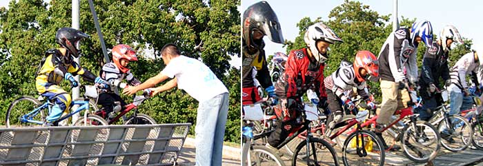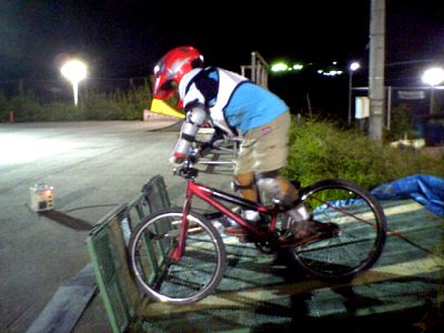 先週のレースの時のスタート直前の写真をKさんが撮影してくれました。 (ありがとうございました)他の選手はサドルに座っているのに、スタンディングに自信のないhitoは既にスタート準備 (笑)昼前にGONZOへ着いたら、、、 子供が誰も居なくて何だか寂し~い受付の方が 『大泉に練習に出かけた方が多いから、、、』 だとか、、、それでも時間が経つに連れて家族連れが増えて来てこちらの方や、こちらの方、こちらの方と一緒に楽しそうに走ってました。tsuka☆nagi/父ちゃんから、ロールと第2バームをジャンプしないで速く走る方法を教わったけど、tuka君がスグにマスターしたのに対して、hitoは最後まで理解できないようでダメダメ~BMX経験3ヶ月未満のhitoには、まだ無理? 時間が掛かりそうな予感。。。トレールジャンプでは、奥の4個は飛べるようになったようです。 顔着もするけど、、、(笑)