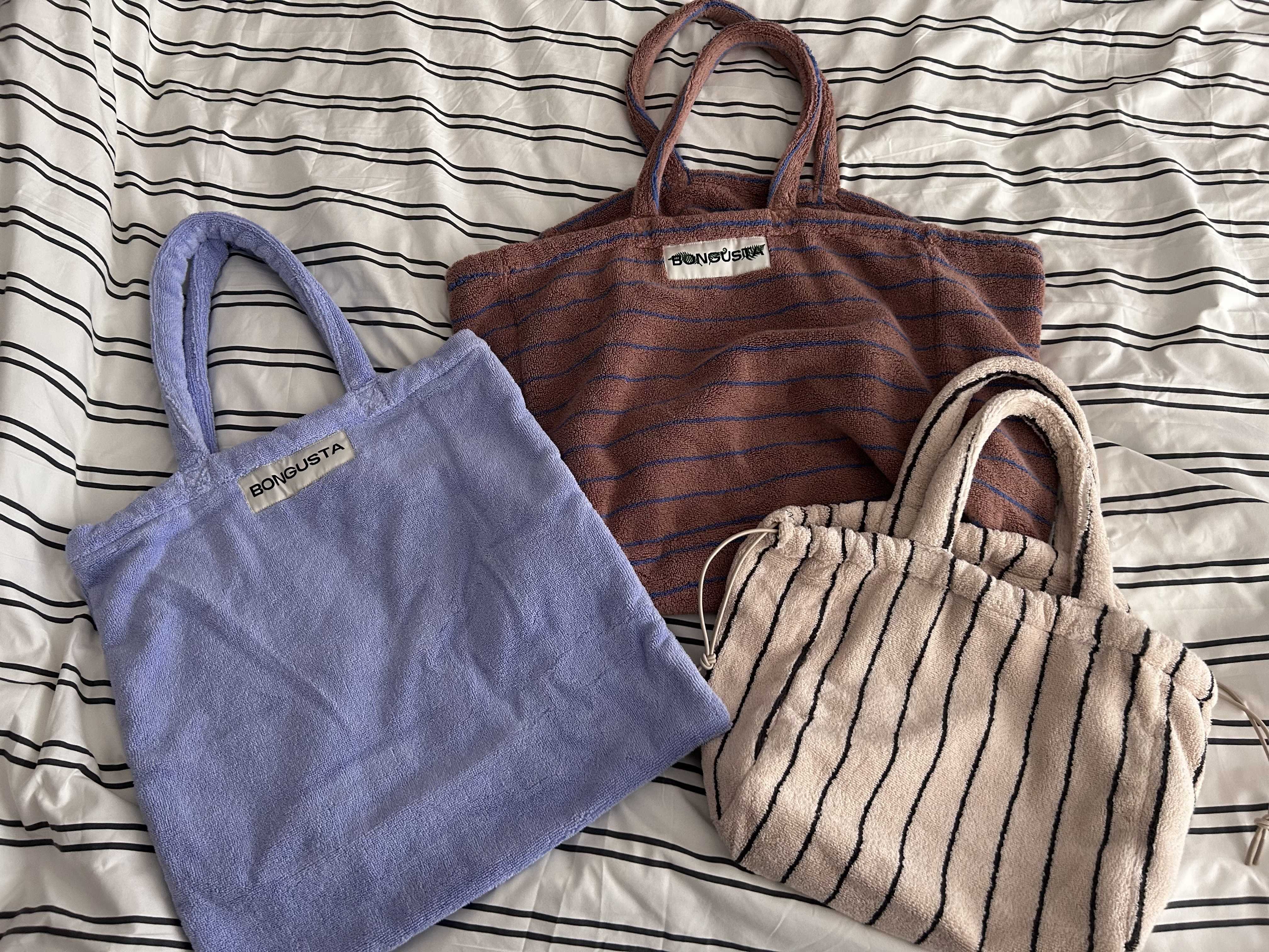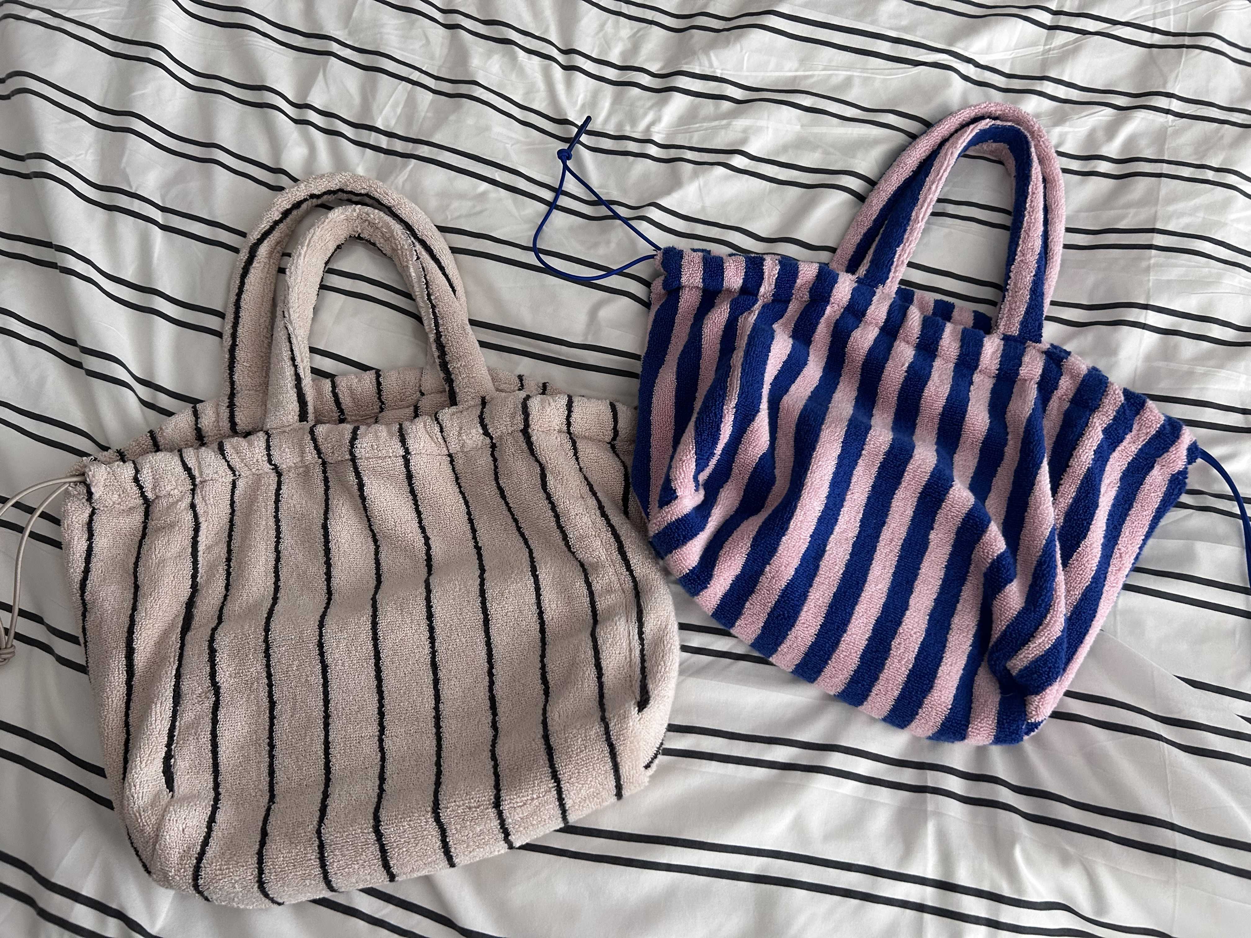 ストライプのタオル生地のボングスタのバッグは結局巾着型も買ってしまいました。
