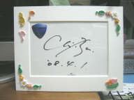 先月行った竹善さんのライブ会場で、CDを買ったら、ピック付き直筆のサインが付いてきました。直筆どころか、サインなんて今まで持った事がないので、どうしたものかと思っていましたが、色紙がぴったり納まる額をもらったので、早速入れてみました。紙で出来たちょーシンプルな物だったので、なんだか寂しいな~と思い、ちょっと飾り付けをしてみました。”クイリング”というもので、3ミリくらいに切った細長い紙をくるくる巻いて貼り付けるだけ。でも、1個のパーツは4ミリ~5ミリ位で、額縁飾るのに54個のパーツが必要でした。めんどくさかった~(笑)