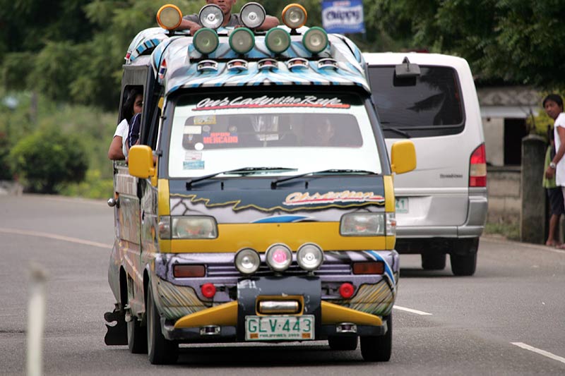 とは多くはフィリピン製のキットカーで、丁度、昔の日本の「ボンネットバス」みたいな乗り合いバスのこと(写真は割と新しくて小型版)。エアコンもなければ窓もない。ドアすらない。