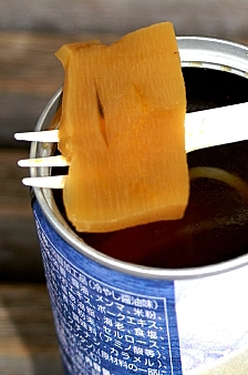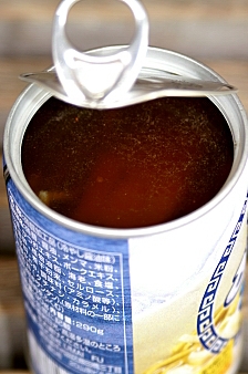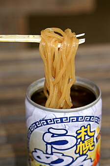 あぁ、確かに麺だ。どーでもいいけど、コンニャク麺だ。きっと小麦麺だったら溶けるだろう。だがマテ、この変な味、なんとかならんかい。おでん缶とよく似た味。自信を持って商品にしたのか?ってくらいまずい。本当にこんなの、名物にすんのか。恥ずかしい。将来、おいしくなったら、もう一度食べてみてもイイ。私、ラーメン残したの、初めてです。缶の中に「乾麺」と「つゆ」の袋を別々に入れて売るとかしたほうがいいかも。