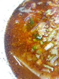 激辛ラーメンに唐辛子を、まんべんなく振りかける。