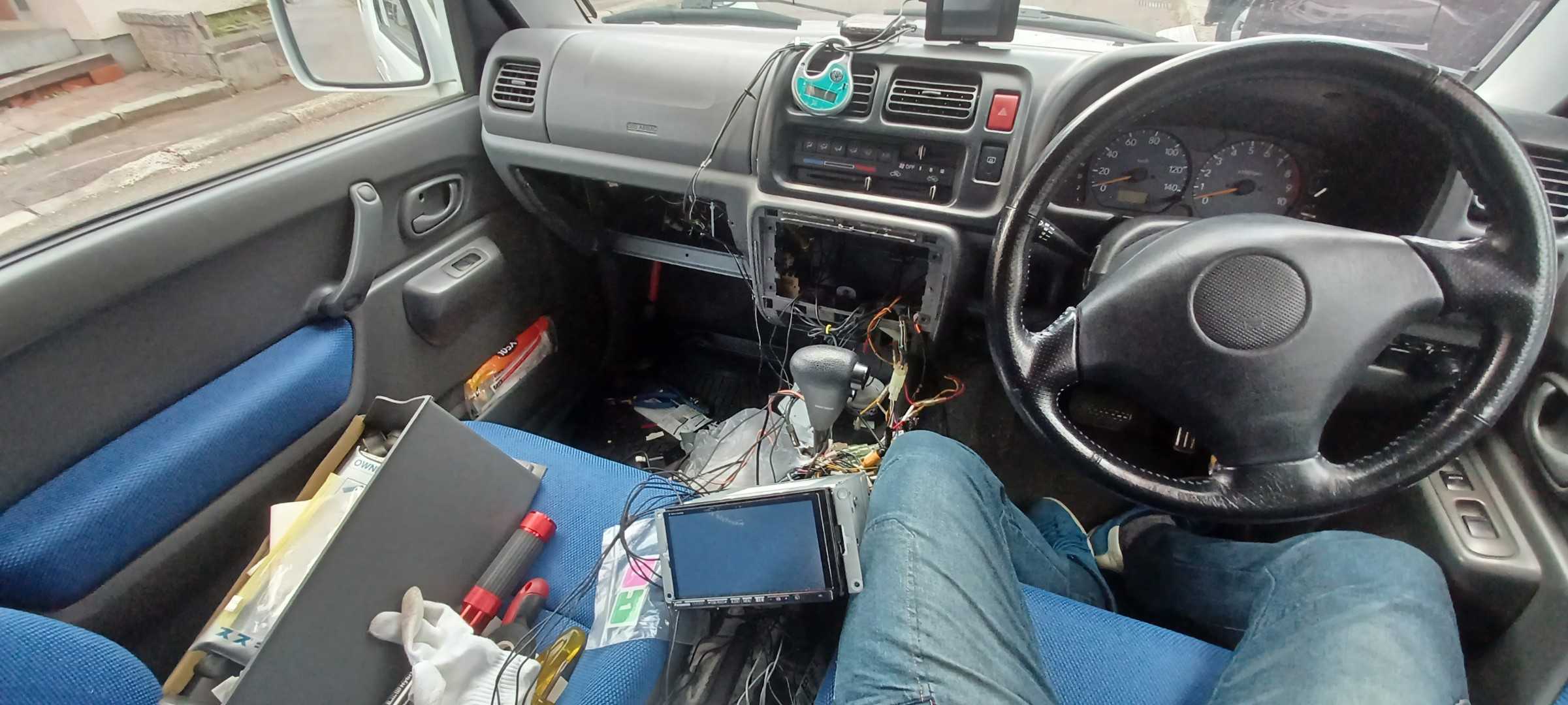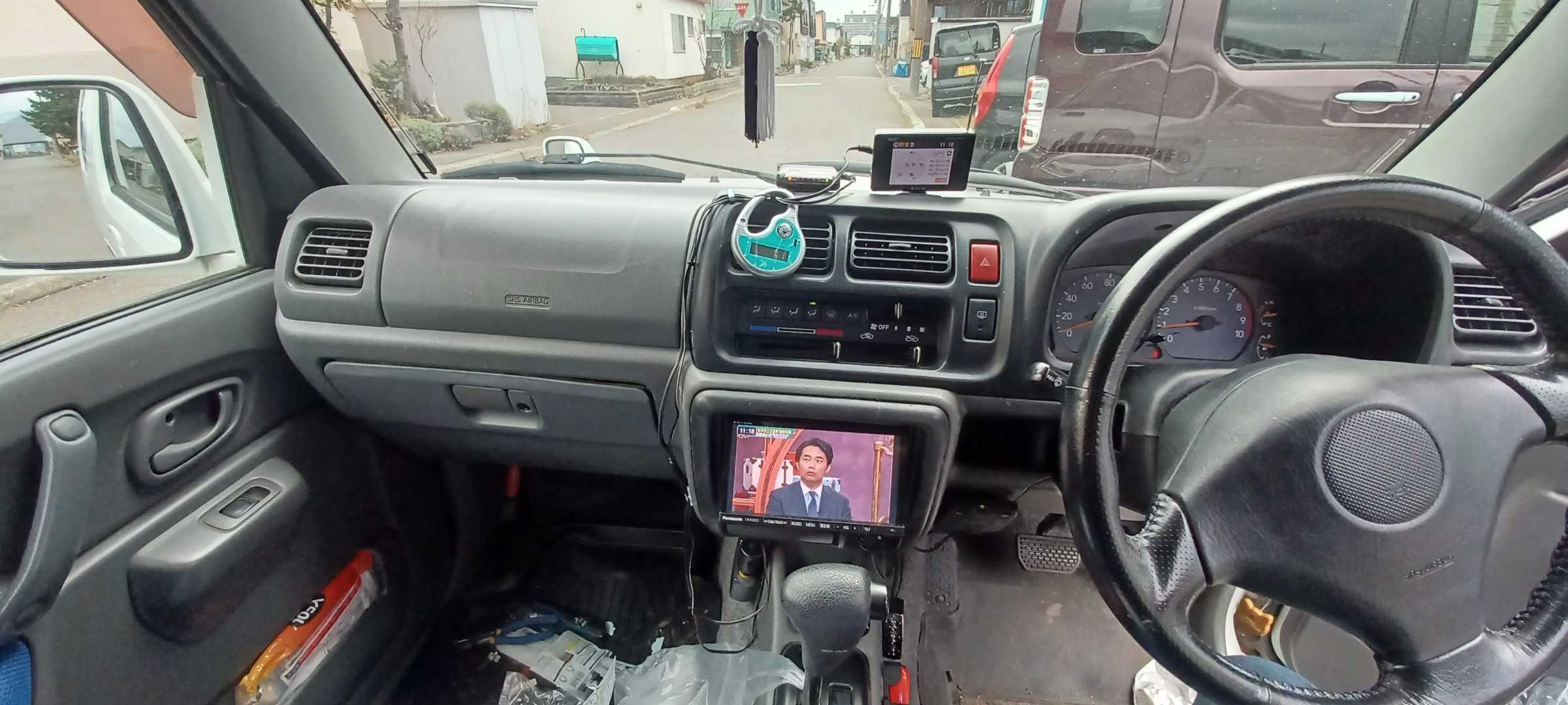 今回は平成12年のジムニーに付いていたナビが当時のもので、地図は古くアナログテレビなのでハイエースから外したSDナビを取り付けました。