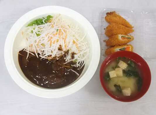 大根サラダにS&Bのレトルトカレーをかけたもの、肉巻き野菜フライ、アマノフーズの豆腐とほうれん草のお味噌汁です。