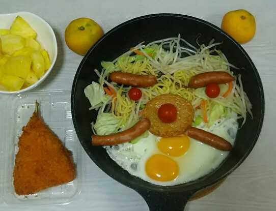 ふじみつの丸天、ミニトマト、めだまやきを添えました。