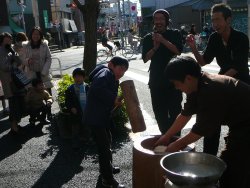 あけましておめでとうございます。本年もどうぞよろしくお願いします♪昨日の夕方に帰ってまいりました。一週間以上ずっと晴れ間続きだった明るい関東から、車で高速を進むごとに雲が分厚く覆いつくしていく暗い北陸の世界へ・・・・。世界の明るさがこうもちがうと気分もちょっと暗くなっちゃうわ~。それでも本日は北陸も珍しく晴天で景色もよく、ちょっと気分も軽くなったりして・・・。さて、年末年始の出来事ですが。まず年末31日。お餅大好きな三兄弟とウチの父。お正月もこないうちからママの実家で餅を食べまくり、12月の幼稚園の体重測定では16,2kgだったたいぶーが、ママの実家最終日の大晦日の朝に計った体重が16.8kgと見過ごせない値だったので、その日は朝から腕立て腹筋スクワット他、おじいちゃんの田んぼまで散歩を兼ねたマラソンなど、可能な限りの激しい運動をさせて体重を減らす努力をした。そしてお昼に焼きそばを食べて、さぁもう一度計ってみようと体重計に乗ったら17.0kg。増えてるじゃないか。パパの実家でも食べ放題になるに決まってるので体重を減らしておきたかったのに・・・・。そしてパパの実家・東京へ移動。元旦には旦那の兄弟家族も集まりにぎやかにドンチャン騒ぎの宴会。義父母の手厚いもてなしで飲み放題食べ放題の三日間でした。元旦には歩いていける近くの天満宮へ初詣に。いつもは賑やかで人通りの多い人気地区のパパの実家周辺もお正月は店もあまり開いてないのでいつもより閑散としていた。その一角で賑やかな掛け声が聞こえるなぁと思ったら、飲み屋の店頭で若い店員さんたちが元気に餅つきをしていた。なかなか楽しそうだったので立ち止まってみていると、「ついてみる?」とツインズに声をかけてくださったのでやってみることに・・・。 重~い杵をなんとか振り上げて弱々しくついていました。そして「つき上がったら皆さんに差し上げますので後10分ほどお待ちください。」といわれ自分のついたお餅だし、タダだし、大好きだし・・・で、どうしても欲しがったため、義父母やパパには先に行っててもらい、ママとツインズはお餅がつきあがるのを待つことになったのだった。本当はつきたてをすぐに頂いたらもっと美味しかったのだけど、まずは初詣という大事な行事があったため、自宅に着いてから頂きました。でもなかなか美味しかった~♪。ちなみに初詣では恒例のおみくじ。ママはあまりおみくじの結果を気にするタイプじゃないので毎年ひきます。すぐ忘れるの今年は・・・・。三兄弟全員がなんとそれぞれ番号違いの「大吉」。なんという好調な一年の滑り出し・・。それに比べて親は二人とも中吉。しかも中身はあまりよくない内容であった。これで中吉?もちろんそのまま木にくくりつけて帰宅。それなのに大吉の三兄弟はその大事なおみくじをパパの実家の廊下やリビングや寝室のあらゆるところにゴミのごとく落としており、扱いは最悪。こちらに帰宅してからも子供の部屋のじゅうたんの上に一個落ちていた。きっと運もそのまま落ちてしまったのに違いない。ちなみに本日のたいぶーの体重は・・・・・・17.4kg。年明け早々最悪じゃ。家に帰ってきたからにはママが腕によりをかけてひもじい思いで痩せさせてやる!さて、翌日2日の東京タワーの話はまた明日・・・・。