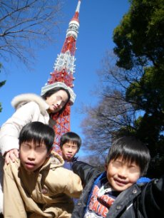 1月2日。生まれてから結婚するまで大阪に住んでいて一度も通天閣に上ったことがないママがナゼ東京タワーに二度も三度ものぼらにゃならんのだ。かつてはパパが自宅から自転車で行った事もあるという近場の東京タワー。子連れでは自転車ではいけないので電車に乗ることに・・・。学生時代は新宿が庭だったともいっていたパパだったのだが、東京を離れ、関西をも離れて久しく田舎暮らしをしていたせいか・・・・・・・新宿駅構内で迷った。「私なら絶対梅田の構内で迷ったりせぇへんで。」とママに嫌味を言われるパパ。オレの学生時代には大江戸線なんていう路線はなかったのだ・・・・というのがパパの言い訳。まぁ、迷ったといってもしれてるのだけどね。さてそんなこんなで多少時間を取られたものの11時すぎに東京タワーへ到着~♪子供達は今まで遠くからしか見たことが無い東京タワーに大興奮。 たいぶー:「しゅっげぇーーーっ!」そりゃぁ君の身長から見たらさぞかし東京タワーも大きく見えるでしょうさ。着いてみると・・・・・ゲロ混み。50周年だとはいえ、今更東京タワーに上りたい人がこんなにいるなんてビックリ。エレベーター待ちが1時間以上の長蛇の列。もちろん正月デブを連れた我が家がエレベーターに乗るわけもなく、階段への入り口へ・・・・。でもなんとこちらも入場制限アリ。入場券を買うのに20分ほどかかってしまった・・・。階段は600段あるというのでどんなものかと思っていたらマンション9Fまでいつも階段を使っている我が家にはたいした運動にもならず、息切れするほどでもなくあっという間に到着。到着した第一展望台ももちろん人混みで溢れていた。ここからさらに100m上空にある特別展望台に行くにはここからのエレベーターに乗らなくてはならずこの待ち時間がなんと80分。上にあがっても対して景色も変わらないだろうし、すでにこの時点で12時を過ぎていたのでダレがそんなに待つかよと、もう降りようかと思っていたらたった一人ショー兄だけが上まで行ってみたいと主張。多数決でいえば即効で降りるところだけど、せっかく来たことだし、もう二度と連れてくることも無いはずだし、今回はショー兄の気の済むようにのぼらせてあげるか・・・と長蛇の列に並ぶ羽目に。まぁ意外と(?)スムーズに50分ほどでエレベーターに乗れたものの、特別展望台は狭く、軽く一回りして3分ほどで下に降りたいといい始めた。ご・・・50分も待って見ることができた景色なのにたった3分で降りますか?とりあえずお天気がよく富士山がとってもきれいに見えたので写真撮影♪左の写真にはバックが光ってしまって写ってないけれど、右の写真のようにきれいに見えたのです。 下の展望台に降りて三兄弟が祖父母への土産(本当はいらないだろうけどね)を買い、下が透けて見えるというルックダウンウィンドウに立ってみた。 たいぶーも平気。帰りも再び階段で降りて名物のカレー(?)を食べて帰りました。本当は東京で唯一の外出日であるこの日、時間が余ればユザワヤかルミネによってビーズを見たかったのに、すでに下に下りた時点で3時を過ぎており、その夢も泡となって消えてしまいました・・・。最悪ぅ~ひたすら疲れた一日でした。でも自宅に帰って来てもレゴで東京タワーを作っているたいぶーを見ると頑張って行った甲斐があったというものだわ。