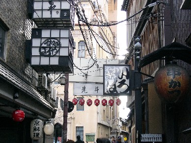 先斗町(ぽんとちょう)♪富士の高嶺に降る雪も、京都先斗町で降る雪も・・・の先斗町。(相当古い歌謡曲ですが、お座敷小唄という歌の出だしです)学生時代、この界隈で、クラブの宴会があって、お酒に弱かった私自身は鍛えられたところなのかもしれません。そのときの御茶屋さんは、ちがうお店にかわっています。左にあるお店は、串かつ・おでんとかがおいしいので、このあたりを通ったときふらっと寄るお店です。まだそういうお店もいくつか残っていてほっとします。大阪の法善寺横町もそうですが、こういう狭い小路をちょっと歩いてみるのもわるくありません。先斗町のとなりは、鴨川。夏になると川床で料理を出すお店もあります。四条大橋から眺めているとこんな感じです。暖かくなると、みごとなまでにカップルが等間隔で座っていて、それも風物詩のひとつです。京阪電車は以前、川べりを走っていましたが、今では地下にもぐっています。四条河原町-先斗町-四条大橋ー京阪四条駅-祇園(八坂神社)こんな位置関係です。