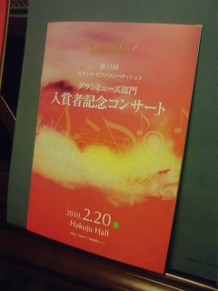 午後から東京文化会館小ホールにいました。LET’S ENJOY PIANO-INGという、アマチュアピアノコンクールで以前優勝されたかたのジョイントコンサート、今回で6回目となりました。 ショパンイヤーでもある今年はロマン派名曲集ということで素晴らしい演奏を聴かせていただきました。<プログラム>ショパン 即興曲第1番 変イ長調 op.29 スケルツォ第2番 変ロ短調 op.31(アンコール)シューマン トロイメライリスト 超絶技巧練習曲 第5番 変ロ長調 S139-5 バラード第2番 ロ短調 S171 半音階的ギャロップ S219**ショパン ワルツ 変ニ長調 op.64-1 「子犬」 ノクターン ロ長調 op.62-1 ポロネーズ 変イ長調 op.53「英雄」(アンコール)ショパン=ゴドフスキー 「子犬のワルツ」ショパン 幻想曲 ヘ短調 op.49 舟歌 嬰ヘ長調 op.60(アンコール)リスト 愛の夢 第3番(4人でアンコール)8手連弾 日本の唱歌のメドレー***東京文化会館のホールのなかはほぼ満員。アマチュアとはいえ、これだけ人を集めるパワーがあるのだと熱気にあふれたホールの人たちを見ても感じました。それぞれ個別にもファンは当然のようにいますし、しっかり企画を練って忙しいながらも発表する準備をされ、それぞれ個性あふれる演奏でした。ロマン派といえども、ショパンといえども、それぞれに興味のあるところは異なり、面白い選曲だと感じました。この会は、2002年横浜みなとみらい小ホールでおこなわれた第1回目から聴き続けていて、会を重ねるごとの充実ぶりには驚かされます。同じピアノ教室のメンバーも出演者のなかにはいて、ピアノの発表会とか一緒に出たこともあったりするので、私にとっては、とても励みになります。PINO-ING という不思議な単語がコンサートのタイトルに並ぶのですが、このINGを実践されていること、よくわかります。演奏を聴いても、この曲が好きで演奏されていることも、アマチュアならではの醍醐味なのだと思います。コンサートのなかで、1年前から準備に入ったと聴きましたが、また演奏会があったら必ず伺いたいと思っています。いまのところ、PIANO-INGは、6回とも皆勤賞で聴衆になっています。新たな境地にたたれて、自分の励みにもしたいです。(主催者のHP)http://allegro.dip.jp/piano-ing/concert/(ご参考)http://plaza.rakuten.co.jp/pingpongpang/diary/200802100001/http://plaza.rakuten.co.jp/pingpongpang/diary/200702250000/