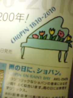 ぶらあぼ3月号を楽器店でもらってきて、ぱらぱらと見ていました。表紙をめくったところにあった、たくさんのショパンのCDの広告に目が行きました。ピアノの詩人ショパン、生誕200年!ショパンを身近に楽しもう。ということで、10枚のCDが紹介されています。頭すっきりショパン・・・黒鍵のエチュード、子犬のワルツほか雨の日にショパン・・・雨だれ前奏曲、木枯らしのエチュードほかテレビで聴いた、ショパン・・・別れの曲、ノクターン遺作ほか華麗なる、ショパン・・・エチュードOP.10-1、ワルツ2番ほか映画で聴いたショパン・・・ノクターン1番、ソナタ3番第1楽章ほか元気の出る、ショパン・・・軍隊ポロネーズ、英雄ポロネーズほか爽やかに、ショパン・・・ワルツ8番、マズルカ16番ほか心落ち着く、ショパン・・・ワルツ7番、10番ほかマタニティに、ショパン・・・子守歌、ノクターン8番ほかおやすみ前に、ショパン・・・舟歌、ノクターン5番ほかなかなか面白い企画だなあと、10個のキーワードを見て感じました。●曲名を見て、自分だったら・・・・と、あまのじゃくなので考えてみました。頭すっきり、ショパン ・・・・エチュードOp.10-4雨の日に、ショパン ・・・・プレリュードOp.28-4テレビで聴いた、ショパン ・・・・スケルツォ2番(カレーのCM)華麗なる、ショパン ・・・・ スケルツォ4番、ピアノ協奏曲1番3楽章映画で聴いた、ショパン ・・・・バラード1番(戦場のピアニスト)元気の出る、ショパン ・・・・エチュードOp.10-10爽やかに、ショパン ・・・・バラード3番 心落ち着く、ショパン ・・・・幻想曲、マズルカ36番マタニティに、ショパン ・・・・プレリュードOp.28-17おやすみ前に、ショパン ・・・・ 舟歌 プレリュードOp.28-21明日になったら、やっぱり・・・と気が変わるかもしれないものもあると思いますが、考えてみるのはおもしろかったです。
