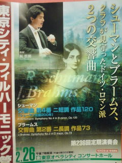 この日の午後、フィギュアスケートの中継をライブで見ていました。パフォーマンスの高い演技に感動しました。銀メダル・・・素直に喜べないのはとてもわかりますが、これはこれでよかったと思っています。ガーシュインのピアノ協奏曲と、ラフマニノフのプレリュードが頭に鳴り響き、トリプルアクセルのスケートの残像が残るなか。その前後で区役所へ行き、神田にある免許証の更新センターへ行き(こんなにがらがらの更新センターがあるのであれば次もここにしよう)、少しピアノを弾く時間があり、そのあと、東京オペラシティへ。アメリカの音楽でもロシアの音楽でもなく、ぜんぜん違うドイツの音楽を聴きに。彼らのもつ明るい音楽が待っていました。(なかなかフィギュアスケートの音楽が頭から離れないのですが。)また今日も招待券をいただいたもの。本当にありがたいです。東京シティ・フィルハーモニック管弦楽団第236回定期演奏会シューマン 交響曲第4番 ニ短調 Op.120ブラームス 交響曲第2番 ニ長調 Op.73阪哲郎(指揮)http://homepage2.nifty.com/tetsuro-ban/frame.htmlウィーン国立音楽大学で指揮を学ばれ現地でも活躍されているということは知っていましたが、実際に指揮を見る機会は今回はじめて。めったにない機会に恵まれました。指揮者自身が本当に演奏したい演目をプログラムに入れているという感じがして、D-Durの調性の明るさをベースに見事な演奏、とても感動しました。クララシューマンの誕生日のために書いたといわれるシューマン4番、Lebhaft・・・シューマンの楽譜の表題にときどきある「生き生きと」ということがコンサート全体に感じるものだった感じがします。ブラームス2番も、この流れを引き継ぐ感じで、楽しく聴けました。シューマン4番が1853年にコンサートで成功させた、その半年後、ブラームスがシューマン家にやってきて、1896年クララシューマンとブラームスの音楽家としての関係は続く時代背景もプログラムノートにありました。