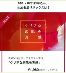 Rakuten RAXY1か月1980円いつでも解約OK楽天ポイント利用しました!11月はSKⅡが届くかも!という噂です!去年はSKⅡだっったそうです!1980円ですが紹介コード入力でお互い100pもらえる実質1890円だったら安い!私の紹介コードは eqs4fh