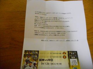 MBSラジオから阪神vs中日戦(7月12日)のペアチケットが送られてきました。にほんブログ村