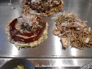 この日は、ハーフサイズのお好み焼き(豚)とハーフサイズのやきそば(海鮮)