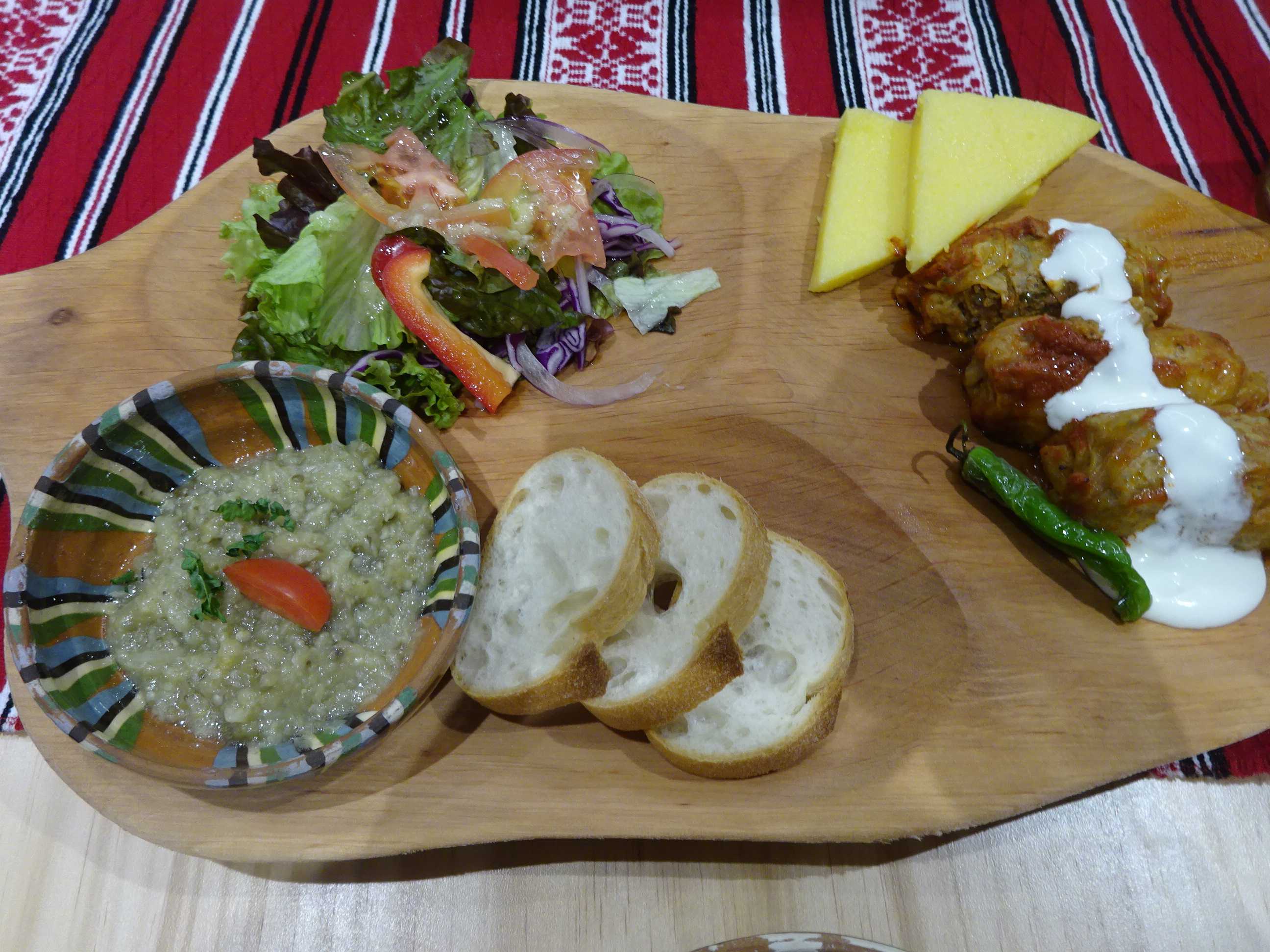 ランチは3種類でBランチにしました。メインはルーマニア風ロールキャベツのサルマーレです。ママリーガ、ルーマニア風焼きナスのディップ、バケット、スープ、サラダが付いています。ディップはバケットにのせていただきました。おいしかったです。森のカフェ ル・ピック(森林植物園内) 2025年12月04日