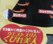 くびれ美人購入 → 本当は息子の靴下を買いに入ったこの辺じゃ~ちょいと有名な激安衣料品店へ入る。靴下探してると「くびれ美人」が飛び込むが、そのまま靴下探し選んでいた。でも、どぉ~しても気になる。やっぱり「くびれ美人」の所へ戻りパッケ-ジに書いてる文字を読んでいく...それで最近見たテレビを思い出した。 コルセットでウエスト締めて、めちゃくちゃ細くなってる女性を。。。・・・って事は、やっぱし締める事!? そんなこんなで5分程悩んで購入してしまった。(*゚ロ゚)今日は、腹巻みたいなソレを装着したまま店に出た ( ̄m ̄*)ちょっと苦しいけれどLサイズだし、くびれた所を想像しながら頑張った。(≧∇≦)今年の目標はくびれ美人( ´∀`)だな!そうそう、昨日のトラックバックで「よしろう」が教えてくれたサイトが面白い。日刊あなた ← やってみてぽ(*^-゚)vィェィ♪よければ1押しのご協力宜しくぅ→