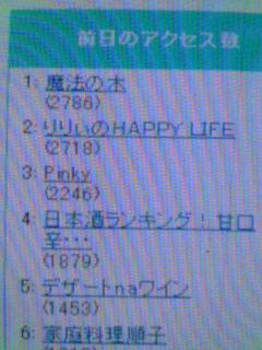 楽天ランキング3位そう.....あの不思議体験の日のアクセス記録です 2246HITって...ありえん。おっ! さっすが!! 魔法の木マスタ- 堂々の1位ですなwやはり...何か間違いのアクセス数でその後は、いつも通りに戻りました(チ~ン)6月12日は記念すべき日ですわさてさて、日曜日は朝からドタバタした日でした息子の用事に付き合い~友達にポット頂いたり~うどん屋でトンペイ焼き食べたり~片田舎の民家なカラオケスナックで歌ったり~ちりめんじゃこ・とうもろこし頂きに行ったり~閉店間近の居酒屋に押し入ったり~ 摂取量はト-タル生中4杯・焼酎水割り8杯かな?願いの☆ピノが出たよ♪左下のピノの形を見て 星型なの~ 願いが叶うといいな 1クリックお願い♪⇒