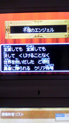 息子とのコミュニケ-ションツ-ルとして任天堂DSのゲ-ムで『ドラクエ9』をしていますがこのシリ-ズは、ウチの青春時代から続くロングセラ-ゲ-ム息子が産まれるずっと前...ってか、息子の年齢よりも若い時からウチは兄達とやっていた。あぁ~そう言えば、息子が産まれる直前に仕事辞めてた頃にも胎教?でドラクエした覚えも最近はゲ-ムする時間も少ないし久々にするとゲ-ムの中でも何するんだっけ?...ってな具合wそして戦いに挑むが、いつも全滅して教会で生き返らせてもらってます。持っているお金は半分無くなるので、ゲ-ムの世界でも貧乏な慶ですそんな慶が最近もらった称号全滅しても 全滅しても決して くじけることなく世界を救い出した ど根性勇者に贈られる クリア称号...ですって おぉ~し!!! 現実世界でも、くじけないぞぉちょっとネタバレ 昨夜のF1PEPSI小豆...炭酸が抜けると、ちょっとイケてきた可夢偉が6位!!! なかなか良かったです。 攻めが良かったね~若さもあるのかな?途中でハミ○○○がマシントラブルにてサヨナラベッ○○が優勝。 ウ○○-が2位。J.バ○○が3位だったけど最後まで諦めない走りに感動あ...一貴は13位でしたね...来年は、ル-ルが変わってレ-ス中の給油が禁止されるんだって。 今日は何の日ふっふぅ~♪これは、2003年の阪神優勝の時。 Rちゃんとくす玉の下で記念撮影していたら地元・朝のニュ-スにデビュ-してました11月2日...それは1985年に遡りますが、阪神タイガ-スが日本一になった日『何の日』で見ましたが、その3年後「1988.11.2」は、シブガキ隊が解散した日らしい 1クリックお願い♪⇒