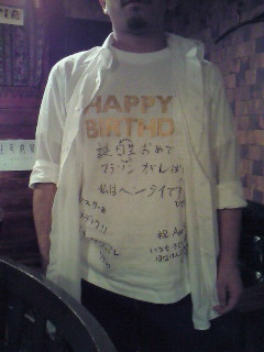 Pinky開ければ良かったぁ昨夜電話くれたM田さん・Sさん・Hっし-・Eちゃん・Uっち-メ-ルくれたH2gさん・Tさん・S藤さんせっかく寄ってくれてたのに本当にすみませんでしたぁ昨夜も、ダルダルでゴロゴロ...大量鼻水でゴミ箱はテッシュの山漫画の世界みたいです...鼻水と共に脳ミソも溶け出してるんじゃないかと思う位ボ-ッとしたよさてさて今頃、土曜ネタ☆ココから汚い画像ですが、御勘弁を...良い夫婦の日(11月22日) が、いつも御世話してる?いや、御世話になってる慎坊マスタ-の誕生日でして 共通の常連様&友達ママさんと祝おうとフライングで1番客狙って行くも既にお客様が...って事で盛大に祝えず、普段と同じ飲み会にとりあえず、プレゼントだけ放置して出直そうってな感じで結局戻れずラ-メン屋昨夜、休んでるウチに電話あって今日プレゼント着てきたのに~恥ずかしいわ・・・だって。 とりあえずPinkyブログネタの撮影班を送り込み パパラッチしてもらいました『寄せ書きTシャツ』 誰かさん誤字だらけ(爆)ズボンを脱いで後ろ向き(よぉ-撮影したな~○○ちゃん)『激臭パンツ』 皆さん気を付けて~ 1クリックお願い♪⇒