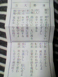 1月5日(水曜) のこと。朝帰宅した後、色々用事で眠れずに夕方に仮眠...お店に間に合う様に携帯アラ-ム目が覚めたら何だかだるいし熱いぞ...熱を計ると 37.6℃ウチの苦手な微熱ってヤツだ しばし葛藤して休む事に決定 ずっと寝てました画像が無いので、2日に行った初詣でのおみくじを...息子は「中吉」だったので結んできましたが、ウチは「大吉」だったので財布に入れてます今年は沢山旅行したいのに、あんまし良い事書いてないねっ(。・_・)ノ”【ポチッと宜しくです】”⇒