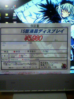1月19日(水曜) のこと。Pinky到着早々、群馬に行ったM川くんと長電話オバケが出ると言うホテルに仕事で泊まっているそうな...怖くて電話したんだねwDさん御来店♪ むちゃ暇やなぁと言われながら寒いト-クの連続親父ギャグで店内冷めきるこりゃ~暖房も効かんわ 寒い寒い(笑)そうそう昨日のブログ更新の時にPCのモニタ-が真っ黒になって使えなくなったので本日、朝一に買ってきました.....っと言ってもビンボ-なので中古のね ブラウン管の17インチから15インチ液晶に変わりました(*´∀`*)ホケェ やっと液晶中古だけど6ヶ月の保障付・なんと5980円 安いね。もっと早く買えば良かった(。・_・)ノ”【ポチッと宜しくです】”⇒