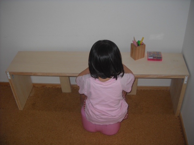 長女おぶぶが小学校に入学したころ、ワタシ達家族は2DKのアパートに住んでいました。何しろ6畳の一室をリビングと寝室と客間と書斎に兼用していたのでおぶぶに自分専用の部屋なんてとてもあげられない。 しかし机ぐらいは何とかしたい。有名メーカー製の学習机など、「ただでくれる」と言われても「いらん!!」と即答する変わり者一家ワタシ達は、さっそく行きつけのホームセンターに走り、木の天板と足を買ってきて自分らで組み上げました。名づけて「世界にひとつだけの木の机おぶぶ1号」結局おぶぶは小学校を卒業する少し前までその手作り机を大事に使ってくれました。やがて新しい家を手に入れ、おぶぶにも待望の自分部屋をあげてイケアでおぶぶ自ら選んだ机、「おぶぶ2号」を買ってあげました。さて時は流れて次女おべべも5歳になり、自分専用の机が欲しいというようになりました。ワタシ達は迷うことなく何の躊躇も無くホームセンターへ走り、ウチを建ててくれた工務店からもらった木の廃材と組み合わせておべべ専用机を造り上げました。それがこれです。名づけて「世界にひつだけの机おべべ1号」おべべは大喜びで、お絵かきにままごとにと重宝してくれています。聞くところによると早くも改造計画が進んでいるとか進んでいないとか?