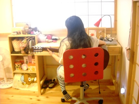 長女おぶぶ、今年で13歳。我が家で唯一自分の部屋をもつ女!生まれてから小学校6年生の途中まで2DKの狭いハイツで暮らしたおぶぶは自分の部屋はおろか机さえも親の手作りの簡易バージョンで我慢ていました。そんなわけで、すうどんの館建築を目論んだワタシ達は、1F北側の個室を長女用に専用設計していただき、THEおぶぶ部屋としました。建具屋さん造作の丸窓付きの木製ドアに白いスポットライト。自分でコーディネートしたIKEA製の机とイスのセットに携帯とネットパソコンと愛用のギターを従えてこもっております。まあ、ええねんけどおぶぶ!!ちゃんと掃除せんと大型ゴキが出るで!!