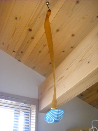 大阪東南部の旧国道から更に山沿いに入り込んだ田舎町の坂の途中にぽつんと佇む我がすうどんの館。蛇、蟻、蚊、蜂、蝶、コバエ、やもり、その他の子虫・・・これらが自然の姿で観察できるので、誰が呼んだか「八尾の旭山動物園」と呼ばれているとかいないとか?と、いうわけでとりあえず補虫対策です。去年の夏に試しに使ってみて多大な効果をあげたアレです。今年も吊りました。頼りなさそうで頼りになる、ゆらゆらガードマン。気が付くと虫で真っ黒とまではいきませんが、意外とよく捕れます。風が通る休日の午後。ロフトに寝転びながら風にユラユラ揺れる虫取りテープをぼんやり眺めていると、なぜかシアワセな気分になります。え?ワタシだけ?