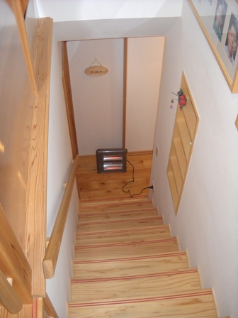 前回報告した冬の寒さ対策その壱も効果はあったのだが今度は根本的に対策してみようということになった。それがこれである。写真では分かりにくいが、1Fの階段前にストーブを置いてある。暖たまったその空気は階段と吹き抜けを通じて自然と2Fに上がってきて遮断するどころか吸い上げたいくらいに暖かいことが証明されたのである。横から見る一人でガンバル小型電気ストーブ君すうどん1号。つまり1Fから上がってくる冷たい空気を遮断するという後ろ向きの対策ではなく、1Fの冷たい空気自体をなんとかするという前向きの対策なのである。世間ではポジチブシンキングとか云うらしい・・・それはともかく、こんなに効果があるとは予想だにしなかった。ワタシタチは天才ではないかと嫁と抱き合って喜んだ。もちろん誰もいない1Fを暖房するなんて勿体無いだの危険だのあれこれ指摘する方々はおられようが、ともかく考え方は証明されたのである。うそやと思うなら寒いうちに家に遊びに来て下さい。手土産もって。これが最初からわかっていれば1Fの廊下か玄関に小さなエアコンを設置するとか1Fの天井を暖房して(床暖房の逆)その空気を2Fに上げるとか色々工夫ができるはずである。残念ながら今年の冬は終わってしまいそうであるが、来冬はさらに工夫を重ねたいと思う今日この頃なのであった。いや~ 手土産待ってます。