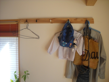 ウチを建ててくれた工務店のコアー建築工房ではここで家を建てた人は建築中に余った木材の端材を自由に持って帰ることが出来ます。でさっそくあれやこれやと頂戴してきてこんなものを造りました。そう、洋服やかばんやその他あれやこれやを吊るすフックベースです。のこぎりで端材を適当に切断し、切断面を紙やすりでつるつるに仕上げたら塗壁の奥にある構造材を探し出して釘で固定するだけ。あとはホームセンターで売ってる適当なフックを取り付ければ完成。幼稚園のかばんやアイロンを待つワタシのカッターシャツや来客時のコートやらなんでもかんでも吊るせます。これに味をしめたウチの嫁は台所の巨大キッチンカウンター下に秘密基地を造成すべく、のこぎりを新調したとかしないとか?それはまた完成したときのお楽しみということで・・・