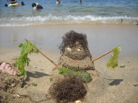 8月6日土曜日。 快晴ぎみ一部黒雲。朝9時半頃自宅出発、11時頃現地到着。いつもの交差点を右折し、いつものおっさんが誘導するいつもの海の家でいつもの料金を支払い、いつもの場所に駐車していつもの海パンに着替える。これまたいつもの道をたどり、いつもの場所にいつものテントを設置しワカメと貝殻がいっぱい浮いてるいつもの二色の浜海岸で初海水浴を行う。いつもの海の家でいつものおでんとおにぎりを買い込み、いつものノンアルコールビールなどをプハーと飲みつつもそもそと昼食する。いつもと違うのは、砂浜でなぜか創作意欲が湧いてきていつもと違うこんなものを作ってしまったことであろうか?さらに、なぜか今回は海に入らなった長女のリクエストでりんくうアウトレットなんたらへ行き、1人700円もする観覧車を横目になぜか100円ショップのセリアで買い物をしてかき氷やソフトクリームを食べ散らかし、さらにカントリーキッチンとかいう食べ放題レストランでステーキやデザートを胃の限界まで詰め込み、駐車場代がもったいないという理由で無駄な買い物をして、無駄な買い物リカバリー節約のために混んだ下道で自宅まで帰ったことか?日焼けでヒリヒリと痛む薄くなった頭皮とおでこと首筋と足に薬用クリームを塗りこみ、倒れこむように布団にもぐりこんだ午後11時半であった。あ~しんど。