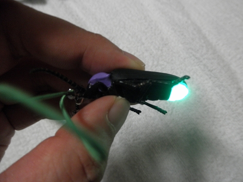 これが噂(?)の蛍のストラプです。お腹のボタンを押すと、お尻が光ります。兄弟がガチャポン(200円)でゲットしたんですが、ちょっと大きすぎてグロテスク。一瞬ゴキがと思うくらいです。せめて小指の爪くらいなら良かったのに・・・。