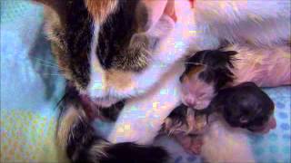 無事に仔猫を出産!出産って大変なはずなのに、仔猫をちゃんと舐めてあげてる・・母は強し!!