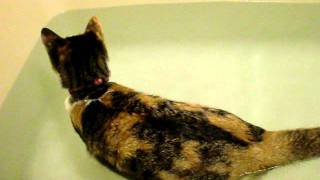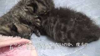 仔猫が水を飲もうとしますが、母猫ペロペロ(^^;仔猫も意地になって飲もうとしますが・・・。