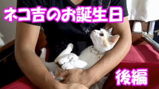 生まれた日は正確にはわからないので、保護した日が誕生日。ネコ吉も1年を迎えたんですね。あの日、飼い主さんに保護されていなかったら、どうなっていたでしょう?無事に1年迎えられて、本当に良かった・・・。でも・・せっかくのケーキが(^^;まさか・・飼い主さんが食べた?