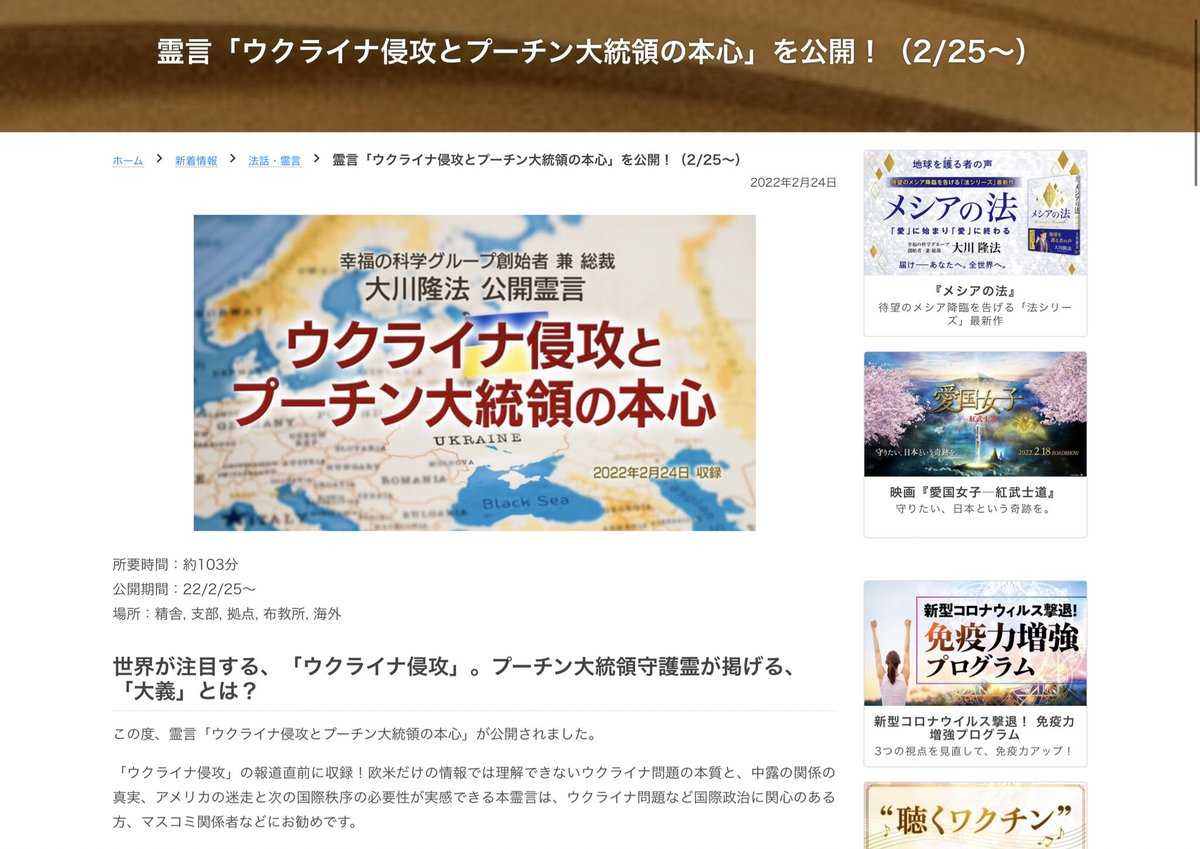 ロシア軍のウクライナ侵攻前から収録されたプーチン守護霊の霊言おはようございます みなさんここ2年間コロナウィルスの感染者や死亡者のニュースばかりだったコロナコロナで世界中が翻弄されていましたがその上にウクライナへのロシア軍の侵攻が毎日のニュースに加わりました情報が錯綜しそれぞれの意見も論説も様々でニュースで流れてくるのは子供が病院に運ばれ治療の甲斐なく亡くなっていく映像や建物が壊されている映像など同じような映像が繰り返し流れていますそのショッキングな映像が脳裏に焼き付いてウクライナ侵攻のロシアに対する批判が大半を占めていますなぜこのようなことになったのかという実は一番大事な根本的な原因や真相が掴めていないのが実情でしょう過去に日本が真珠湾攻撃を行ってなぜ戦争状態に陥ったのかその原因や真相が語れれることなくただ日本が侵略戦争を起こしたという日本悪人説のみが強調され教育されていますなぜ開戦という道を選ばざるを得なかったか戦争状態になることは避けられなかったのはなぜか先日のブログでも載せましたがアメリカは戦争に持ち込むように相手国を追い詰めていきます先の太平洋戦争の時も日本はエネルギー源を絶たれることになり開戦を決意しなければならくなったということが主な原因ですでは今回のロシアのウクライナ侵攻はどうでしょう今日のお題目【ロシア・ウクライナ問題の核心】にも説かれていることですがプーチンの要求は① NATOの東方不拡大を文書で約束せよ②ポーランドやルーマニアなどにミサイルを配置するな③NATOの戦力を1997年以前の規模に抑えよ3点だったがバイデン・アメリカは拒否したこれが主な原因でしょう1962年米・ケネディー大統領はキューバ沖でミサイルを載せたソ連の船を封鎖し米ソ核戦争も辞さずとキューバ上陸を阻止しましたそれはキューバがソ連の核ミサイル配備を容認したからですキューバはアメリカにとっては急所と言える場所ここにソ連の核ミサイルを配備されると軍事的に外交面でもアメリカはソ連に対して何もできなくなり敗北する道しかありませんこれが「キューバ危機」ですウクライナがNATOに加盟してロシアとの国境に核ミサイルを配備されればかつての「キューバ危機」と同じ状態になりますケネディーと同様の処置を取ったのが今回のプーチンではないのかということが言えますそれを分かっていてバイデンは戦争に持ち込ませるために3点の要求を拒否したのでしょうこれを視ていったいどちらに正邪が下るのかロシアが日本のように敗戦すれば戦争を起こした国となり悪人になるのでしょうプーチンはそのことを分かっていて強硬に出ていると見るべきではないでしょうか戦争は悲惨ですプーチンも最悪の決断をしたくなかったはず追い込まれたのです追い込んだのは誰か「後ろの正面だぁ~れ?」ですねこのウクライナ問題は日本にとっては目覚めるきっかけの一つになるかも知れませんすでに安倍元首相も言っているように非核三原則を見直し日米で核シェアをするべきだという意見や憲法改正論なども議論されつつあります中国や北朝鮮が突然侵略してきたらどう対処するかまずそれは台湾から始まるのは目に見えています平和に暮らしていたウクライナの人々世界第3位の核保有国だったのがEU諸国に言われるまま核をすべて廃棄してしまった核配備が無くなって平和が続くと思っていたが核の脅威が無くなり核保有世界一のロシアによってなすすべもなく侵攻されたこれをどう視るか平和だけを叫び続けても平和を護ることは出来ないことが証明されたのではないでしょうか鉄砲には刀では勝てません通常兵器で防衛していても核兵器の脅威には勝てませんでは黙って侵略されてチベットやモンゴル・ウィグルのように人間浄化により拷問・強かんを甘んじて受けるのか何が正義か問われています【ロシア・ウクライナ問題の核心】ヨーロッパーーロシア間では80年ぶりに大きな事変が起きている一昨日2月24日午前中に「ウクライナ侵攻とプーチン大統領の守護霊はどう考えているか」の霊言を収録したこの時点では未明からのロシア軍のウクライナ侵攻の情報はまだ掴んでいなかった現在ロシア軍はウクライナを3方から軍事侵攻しており一説では3時間でウクライナは制空権を失ったといわれているロシアの戦車部隊も北東南から侵攻しており本書が出版される前に首都キエフは陥落するだろう日本のテレビ局大手紙ともロシアの侵略だと大々的に非難しており欧米のマスコミもほぼ同じだアメリカのバイデン大統領の金融制裁も始まってG7各国日本も様々なロシア制裁を行うだろう戦争は嫌なものだがその正当性は検討すべきだろうプーチンの要求は① NATOの東方不拡大を文書で約束せよ②ポーランドやルーマニアなどにミサイルを配置するな③NATOの戦力を1997年以前の規模に抑えよ3点だったがバイデン・アメリカは拒否したキエフのゼレンスキー大統領のNATO逃げ込みは断
