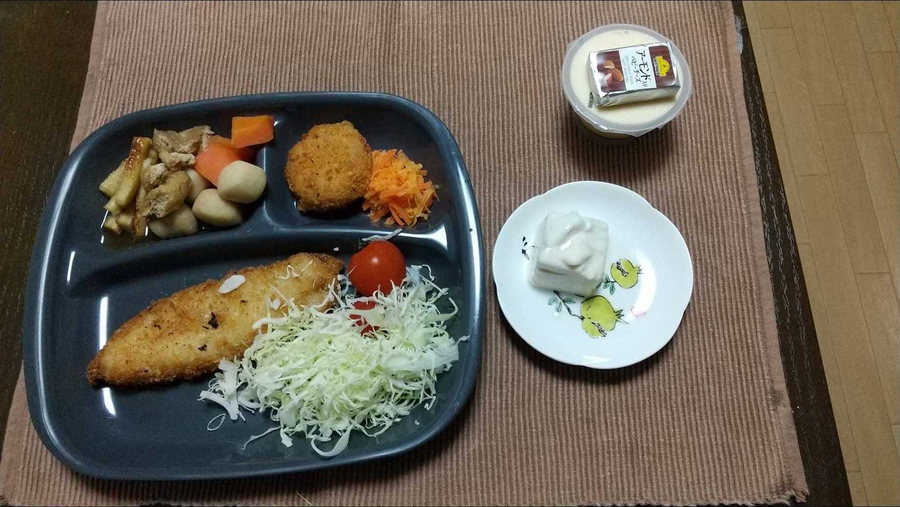 さっそく白身魚のフライとツナフライ、キャベツとプチトマト、豆腐、ニンジンのみりん煮、サトイモとちくわのきんぴら