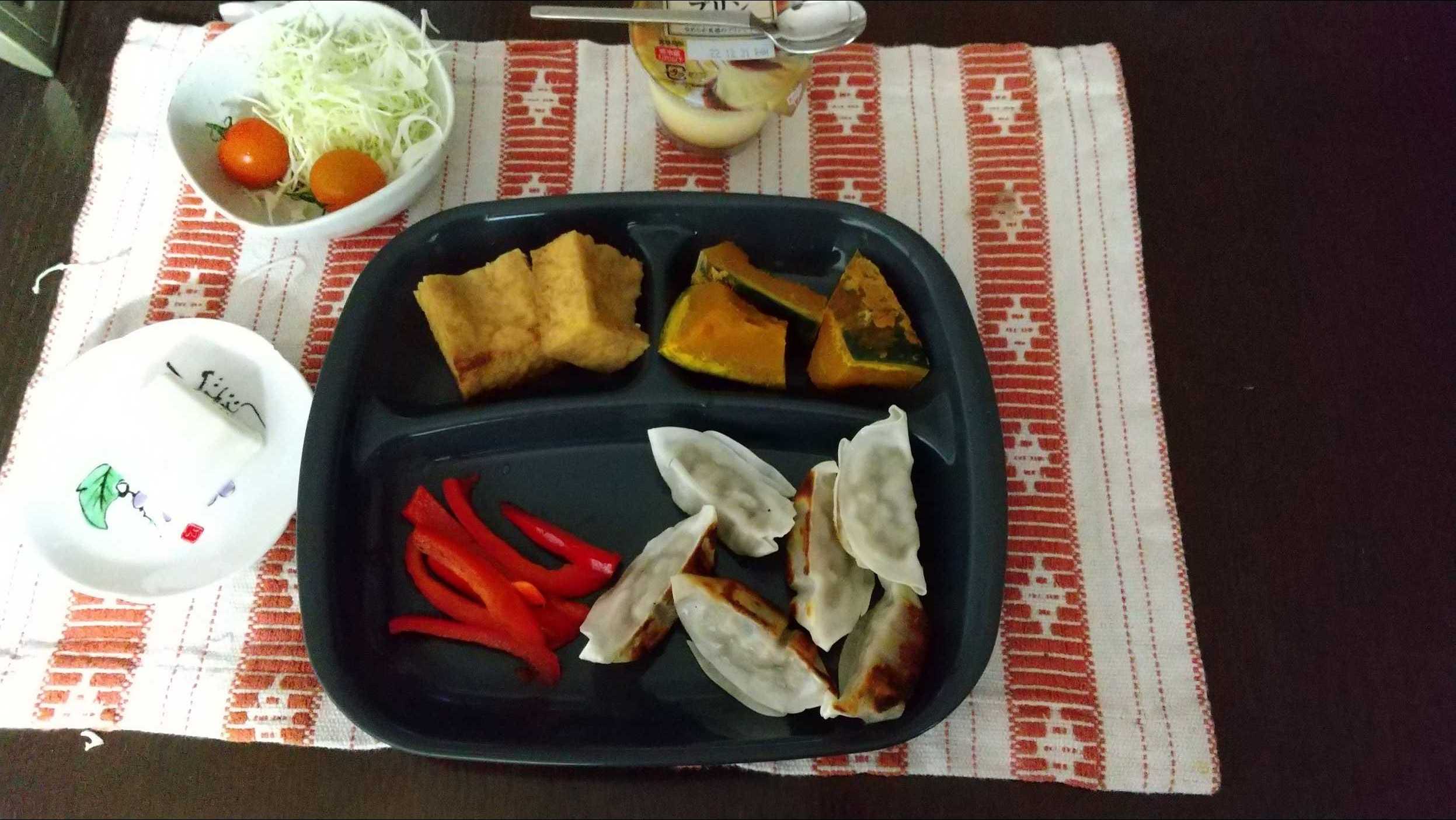 キョウザ、パプリカ、豆腐、厚揚げ、かぼちゃ、サラダ、おやつにプリン