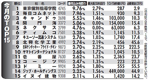 11月末が権利確定日の場合、今年は24日が権利付きの最終売買日なので、この日までに株を買わなければ優待を受けられない。さて、利回りランキング1位の東京個別指導学院は中高生向けの塾。受講料の優待をしている。9位の日本ケンタッキー・フライド・チキンは優待人気株。半期の優待と配当の合計は30円相当だが、権利落ちで毎回100円前後値下がりする。配当・優待取りがトクかどうかは微妙なところ。