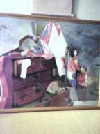 叔母からもらった 100号くらいの油絵です。もう年なので 今の内にあげようと思ったらしい。自分とはちょうど一回り違うだけで 幼稚園のころには送り迎えをしてくれてました。中学の時には 高校の数学の教師と結婚 受験の時には家庭教師までしてもらった。一番なかの良い叔母です。 叔母は末っ子で 祖父が 戦死して一番辛い思いをして、高校はいるときには 公立でなければ高校には行かせないとおばあさんが言って 頑張らせたらしいおばあさんや母は 地元のカトリック系の女学校でしたが その点叔母は辛かった時期も多かったようです。絵の中には小さい頃僕が遊んだ指揮刀が描かれてました。おじいさんが馬に乗り指揮刀を振りかざした勇猛な写真がありました。僕もまねをして刀を振り回していた記憶があります。今は思い出の中にしかない刀が絵の中に描かれてました。コレはずーと残るんだナーって 変なところで感動した。絵は何世紀にも渡ってその人の心が残るもの 改めて嬉しかった 刀の中に自分がいる感じがしたなー