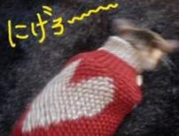 こんにちは、ぴよ母ですよ~♪ブログを始めたばかりの頃に編んだ、ぴよ用セーター(←クリックしてね☆)。セーターの写真だけ載せて、着たところはまた後日、なんて言って、載せてなかったなぁと思い・・・着せたはいいけど・・・ ロボットのようなぎこちない動きで、逃げ出した!!ちょっと待ってよ、ぴよた~ん!!! そ、そんなぁ・・・なんだかイジワルしてるみたいじゃん・・・・・・あまりにも必死に抜け出そうとするので、脱がせてあげました。でも、どうにかセーターを着ているカワイイ写真が撮りたい。せめてぴよの背中に乗せてみよう。 そんなにイヤなのかぁ・・・がんばったのになぁ・・・もう諦めます。それじゃせめて、セーターのアップ写真(新しいデジカメバージョンで)見てください。ハンパに余ってた毛糸で編んだから、色がぴよっぽくない(ナナコのほうが似合いそうな色です)けど、初めてにしては上手く出来ました♪わんちゃんの洋服の編み方見ながら編んだから、微妙に形が合わないのかな?