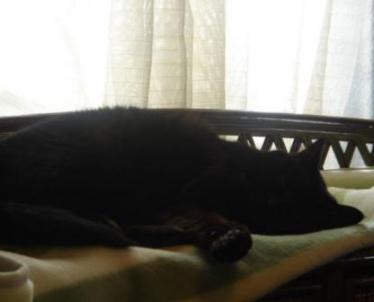 ぴよ母です☆我が家には、意外と隠れファンの多い黒猫のナナコがいます。最近、黒猫ちゃんのお友達が増えたこともあり、私もナナコの写真を・・・と日々シャッターチャンスを狙っているのですが、何しろカメラが嫌いなナナコ。カワイイ顔を撮るのは、至難の技です・・・しかも、いつも寝ています。寝てると真っ黒。あ、起きた。こんな感じで、いつも日なたでゴロゴロしているナナコ、怒ると怖いのです。特にぴよのことが気に入らないらしく(ぴよが、平和に寝ているナナコにちょっかい出したりするせいもある)・・・↑ こんな顔で、怒ります↑ 自慢の牙、いつも口の端から、チラリズムしてます 「どう?わたしのこのキバ。」シャーシャー言われて叩かれて、ぴよは泣きながら退散です。でもナナコは、こんな顔、大好きなのす太パパには見せません。リーダーのす太が座っていると、「おヒザに乗せて~」と甘えます。まるで別人、じゃなくて別猫。絶対、二重猫格だよっっっ